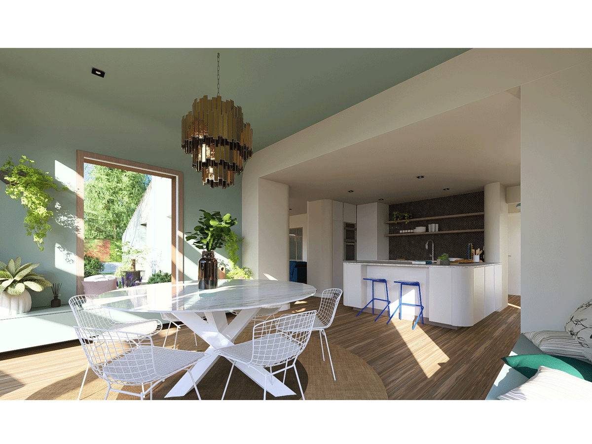Cette maison des années 1960 nécessitait une rénovation pour retrouver tout son potentiel et s’adapter aux modes de vie contemporains. Ainsi, l’ensemble du rez-de-chaussée a été entièrement réagencé et repensé, avec l’ajout d’une extension dédiée à une salle à manger ouverte sur le jardin, offrant une belle transition entre intérieur et extérieur. Inspiré par le style pétillant et audacieux des années 70, l’aménagement intérieur adopte des lignes arrondies qui insufflent dynamisme et légèreté aux espaces de vie. L'utilisation de ces formes et de couleurs vives rend l'atmosphère à la fois accueillante et pleine de caractère, apportant un véritable souffle de fraîcheur tout en restant en harmonie avec l'esprit d'origine de la maison.